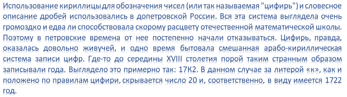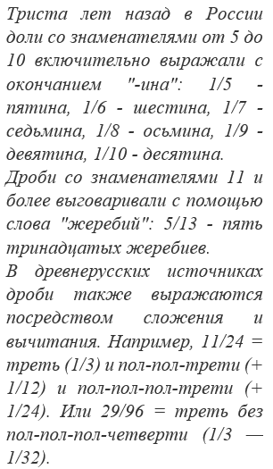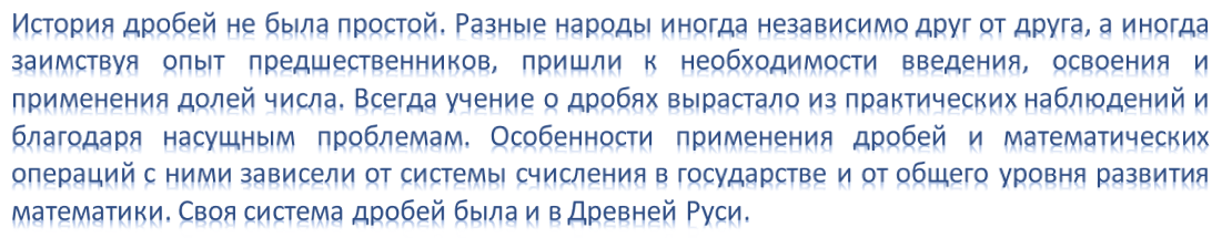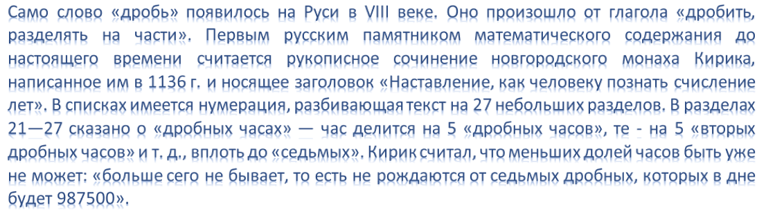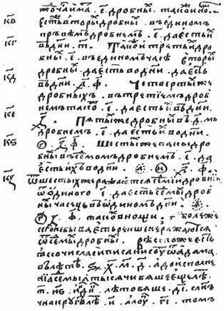 Полная теория дробей, мало чем отличающаяся от современной, была изложена в первом учебнике по арифметике, изданном в 1703 году. Автор этого учебника - Леонтий Филиппович Магницкий. «Арифметика» состояла из нескольких частей. О дробях подробно автор рассказывает в разделе «О числах ломаных или с долями». Магницкий приводит операции с «ломанными» числами, разные их обозначения.