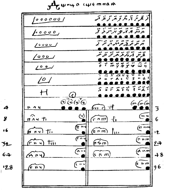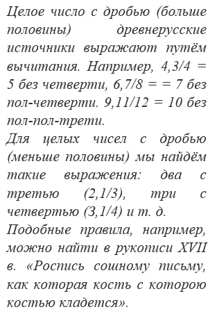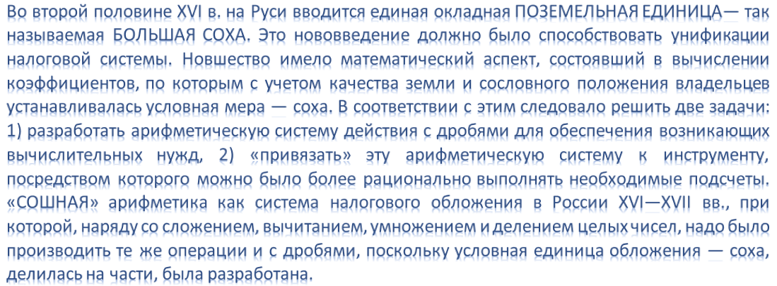 Информацию о рукописи можно найти в книге Бобынина В. В. «Очерки истории развития физико-математических знаний в России», Вып. 2. — 1893. Она представляет собой таблицу сумм, получаемых при сложении различных частей сохи. Практическая значимость равенств в данной таблице состояла в переводе одних сошных дробей в другие, что было нужно для рационализации вычислений при взимании налога с угодий, состоящих из участков владений различной величины и ценности (пашни, леса, луга и пр.). Кроме этой рукописи существовало много правил «Свода мелких костей», т.е. сложения употребительных в сошном счете дробей, вроде «три чети сохи да полчети сохи да полполчети сохи» и т.д. вплоть до «пол-пол-пол-пол-полчети сохи составляют соху без пол-пол-пол-пол-полчети», т.е. 3/4+1/8+1/16+1/32 +1/64 + 1/128 = 1 - 1/128 и т.п.